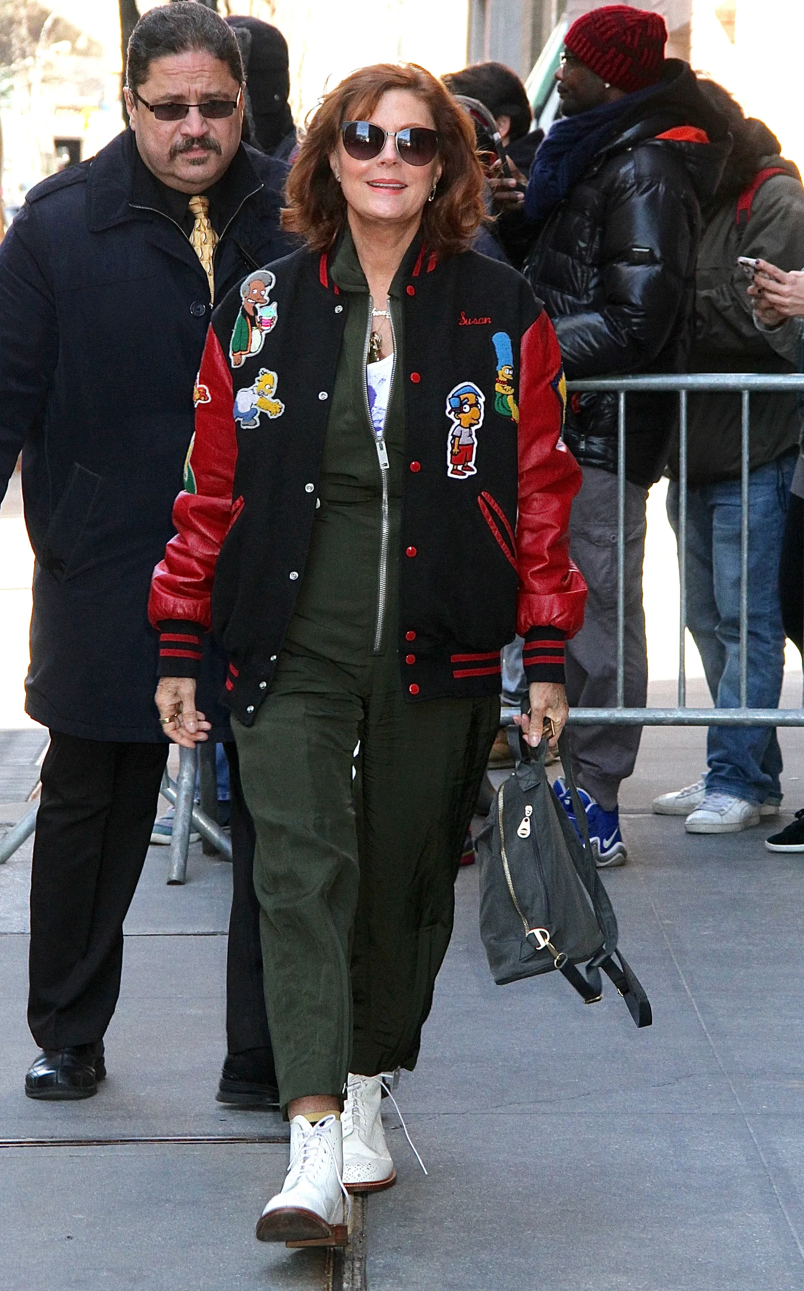 outros atores, na época, também ganharam suas jaquetas - o woody harrelson já foi fotografado com a sua - mas foi susan que fez a jaqueta ficar marcada no mundo da moda, com direito a um artigo na vogue e tudo.