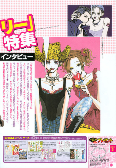 vocalista de uma banda punk, naná segue todo o figurino punk que a gente ama, com saias colegial, jaquetas de couro e corsets - todos saídos das coleções de vivienne westwood, incluindo a camiseta "god save the queen", um dos primeiros designs da estilista, de quando sua marca chamava seditionaries, que virou capa dos sex pistols. pra fechar a referência bem redondinha, o namorado de naná, ren, é baixista em uma banda punk, e é a versão mangá de sid vicious, com corrente de cadeado, cabelo espetado e torso nu com jaqueta de couro.