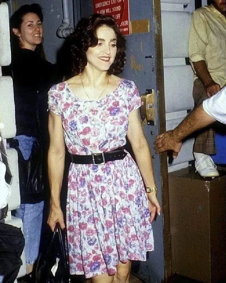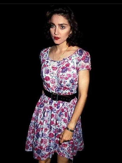 o vestido florido da madonna tá com ela desde os anos 70, quando ficou eternizado numa foto de 1979 da primeira banda punk da cantora, o breakfast club. desde então, ele já foi avistado no corpinho da rainha do pop várias vezes, especialmente na década de 1980 - gosto que de 1979 a 1989 ela teve vários cabelos, mas em 89 especificamente ela tava com os cabelos castanhos, numa cor e corte bem similar ao que usava dez anos antes, em 79. tipo fechar o ciclo, sabe?