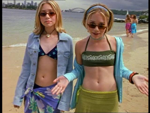 nessa incrível aventura em que as gêmeas vão parar na austrália nós temos a delícia de ume stilo todo trabalhado na tendência-handbook dos anos 2000: aquela coisa meio surfista meio havaiana, cheia de estampa de hibiscos e biquinis. basicamente é isso, biquini e hibisco - mas são as gêmeas olsen, né, então também tem penteados, bandanas, mini óculos de sol, chinelo de plataforma... e um incrível momento de looks cordenados mondrian-inspired que faz valer os anos que passei assistindo a péssima atuação dessas duas.